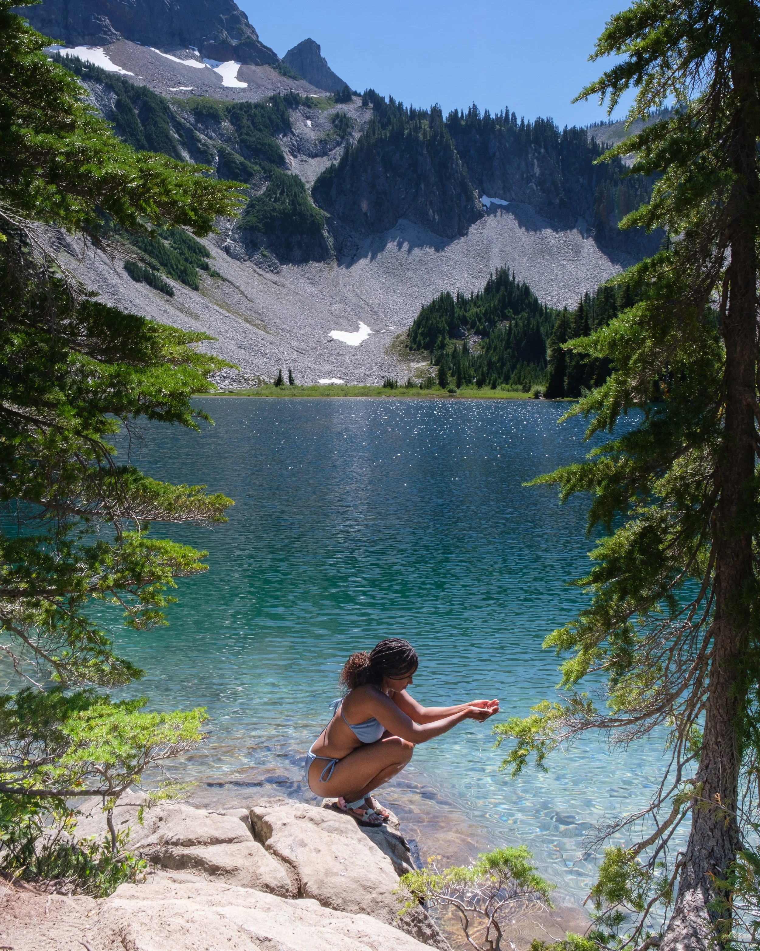 Only a few minutes off the main trail to Snow Lake, you’ll find this gorgeous alpine lake surrounded by evergreen trees with a picture perfect Mount Rainier backdrop. Many people overlook this lake while heading to Snow Lake, so we even had this place all to ourselves for a bit!